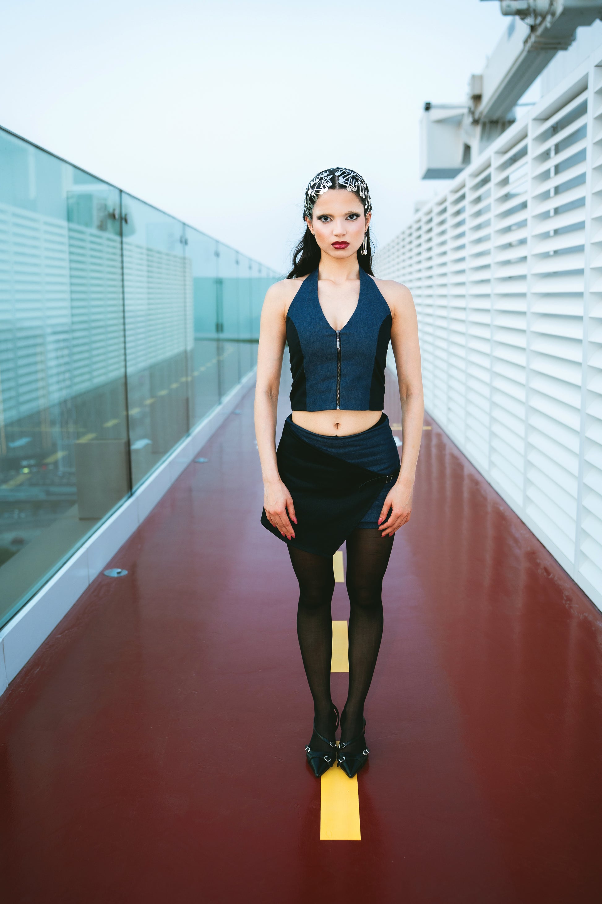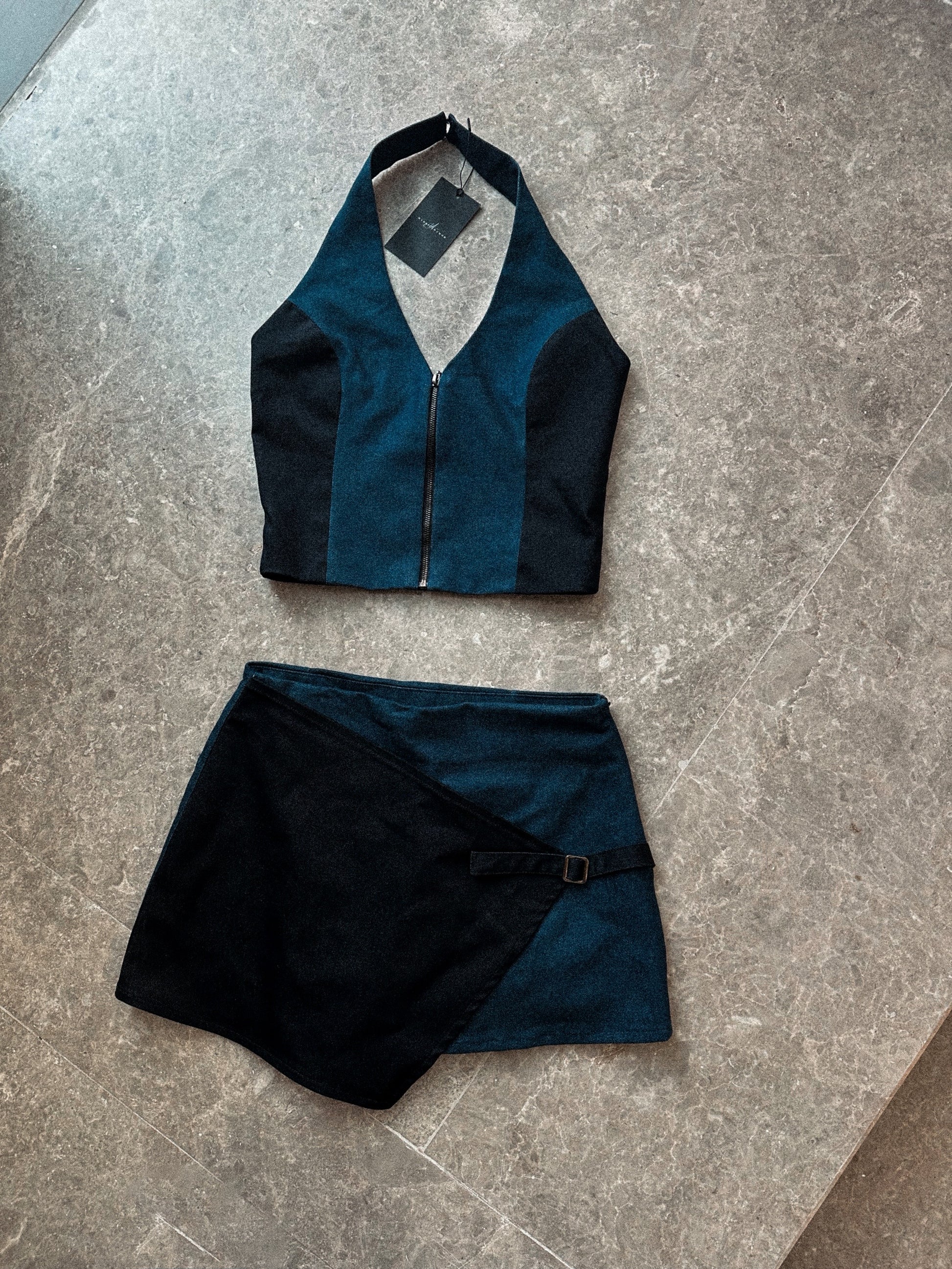 A structured yet playful set designed with modern tailoring and asymmetric details.