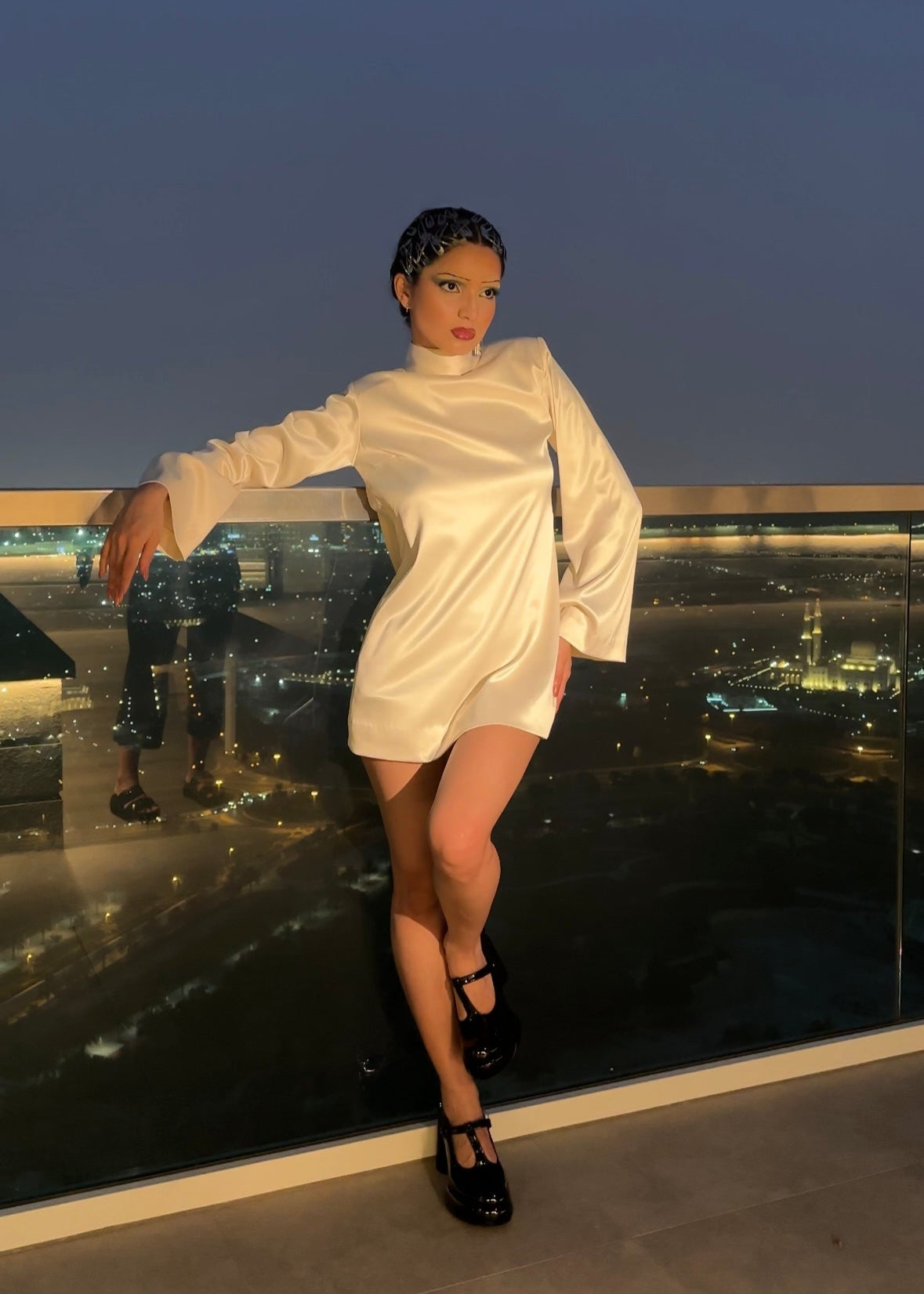 A cream satin mini dress with a clean, structured front and dramatic open draped back. Designed with strong padded shoulders for definition, and finished with a loop and button closure at the high neck